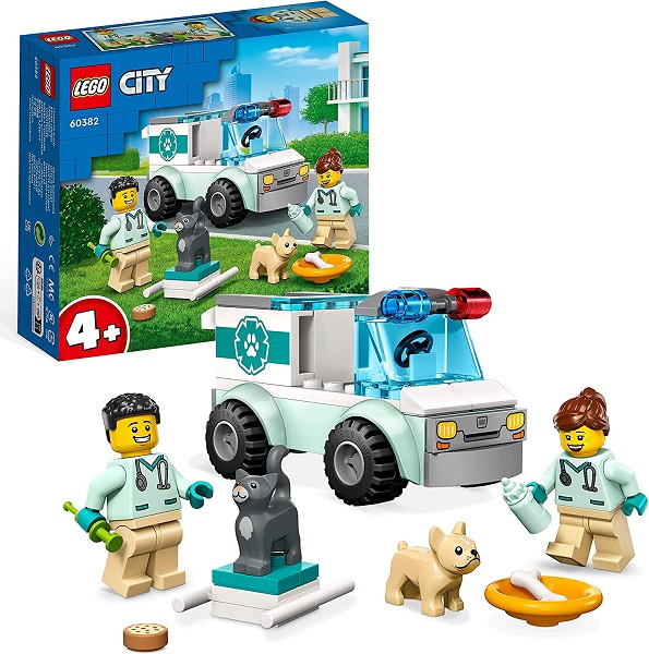I veterinari in erba e gli amanti degli animali dai 4 anni in su si divertiranno moltissimo con questo set di costruzione Furgoncino di soccorso del veterinario LEGO® City (60382), che include un veicolo di soccorso giocattolo con una barella rimovibile, 2 minifigure di veterinario, le figure di un gatto e di un cane, oltre a divertenti accessori per lunghe ore di gioco creativo incentrato sulla cura degli animali.