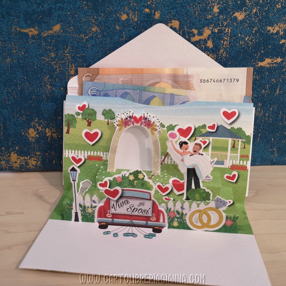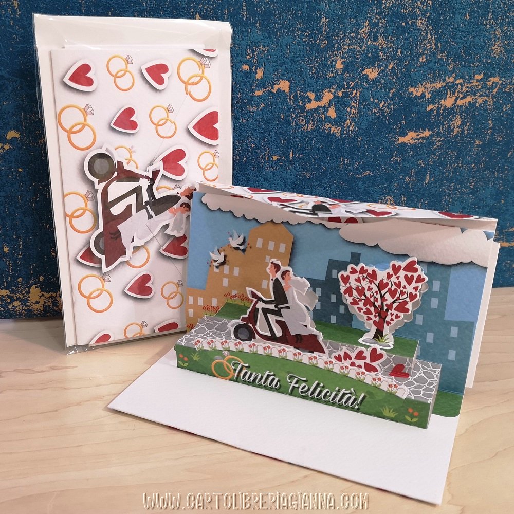 L’originale chiusura “a busta”, rivela all’apertura un pop-up bidimensionale che sorprende il festeggiato!