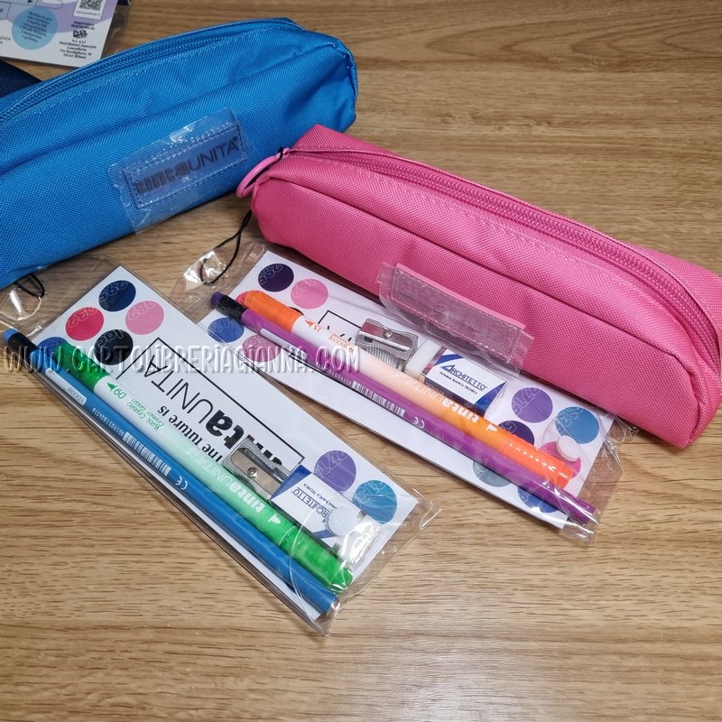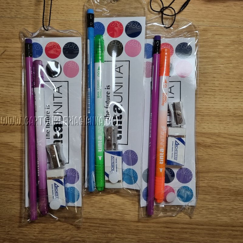 Insieme riceverai: una matita HB con gommino, un temperino in metallo, una gomma bianca e un pennarelli brush bipunta Tinta Unita con punta piccola e punta a pennello.