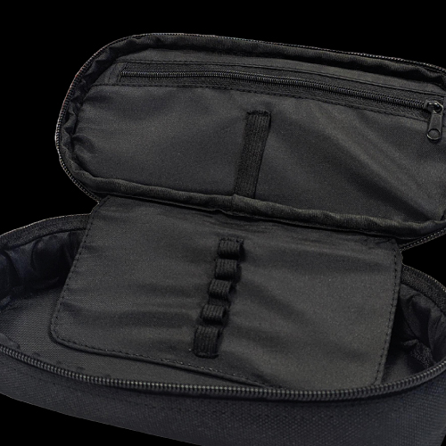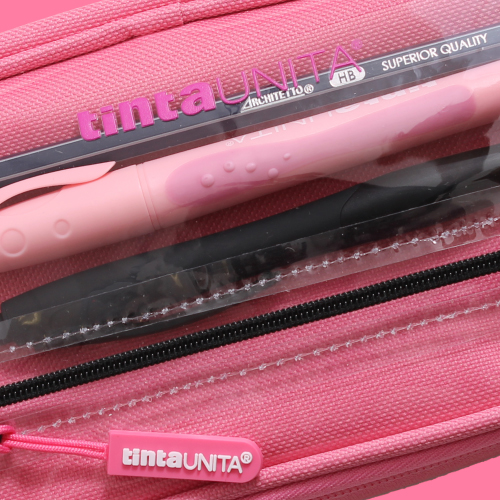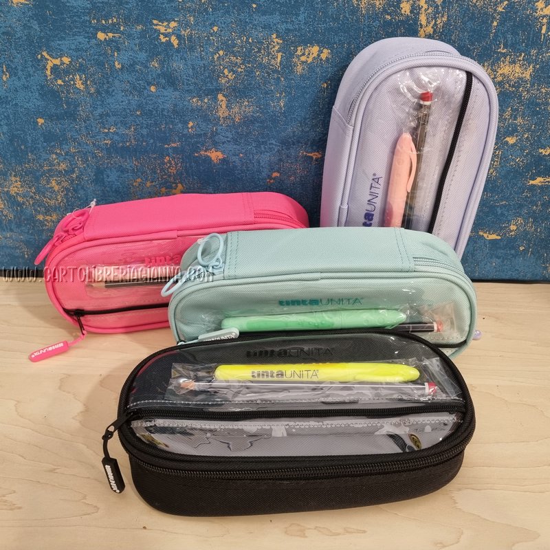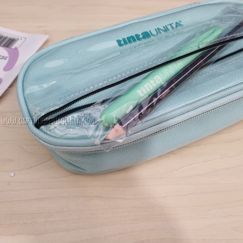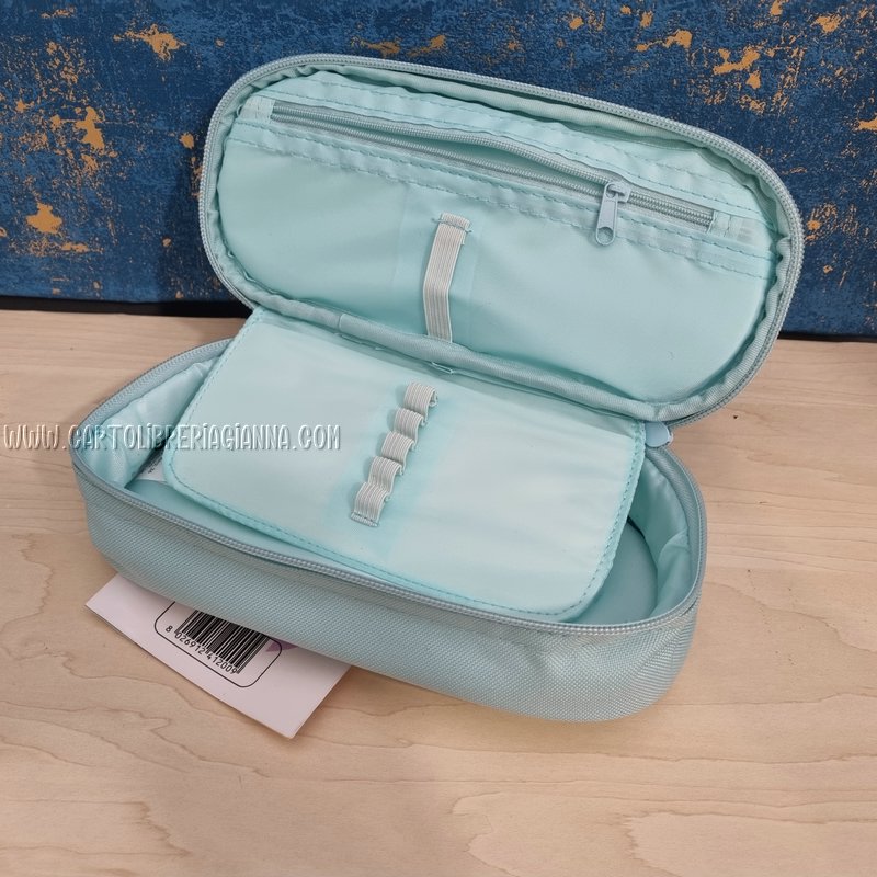 Bustina ovale realizzata in poliestere con tasca esterna trasparente chiusa da zip completa di prodotti per la scuola.