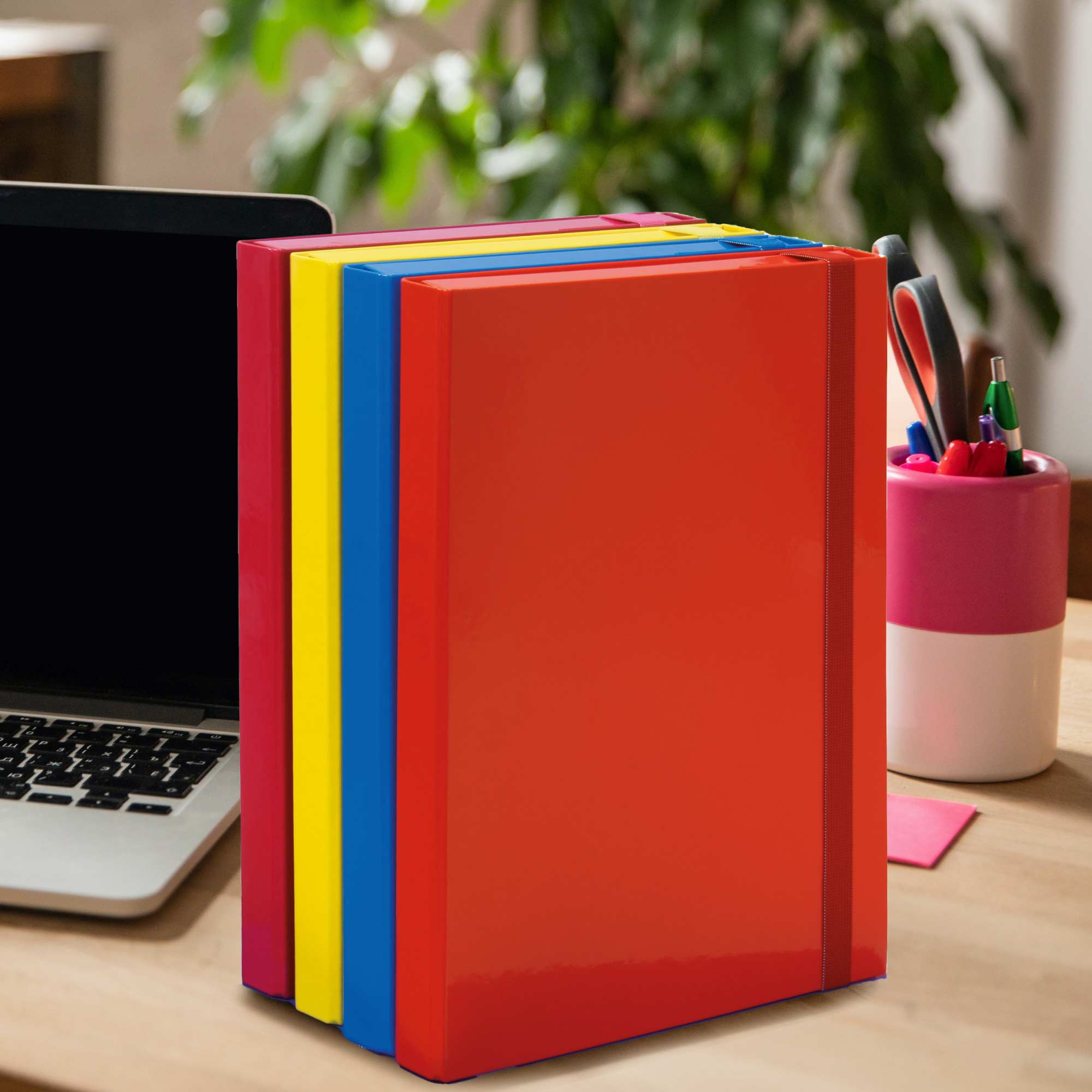 Cartella in spesso cartone colorato da 1,5 mm. e finitura lucida. Chiusura con elastico piatto. Formato esterno 25 x 34,5 cm. Colori assortiti.
