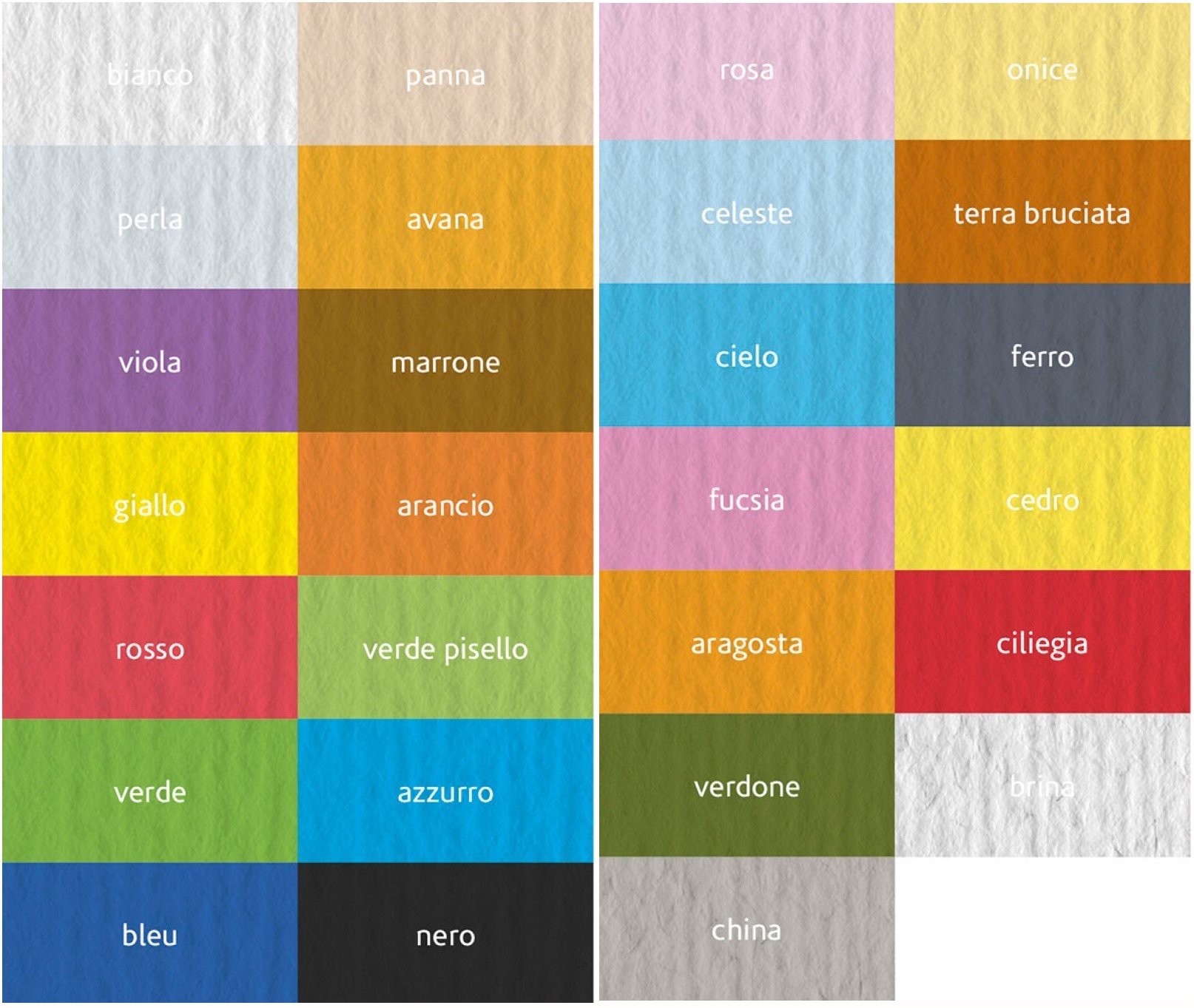 Ampia gamma e vivacità di colori (le varianti china,brina e avorio sono disponibili sono nei formati 50×70 e 70×100).
