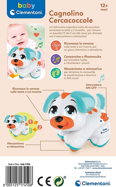 I due pulsanti sul capo e sul muso riconoscono le carezze del bambino: quando vengono sfiorati il cucciolo parla, canta, mugola e dà bacini.