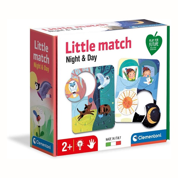 Contiene 12 mini puzzle in cartone riciclato, con soggetti pensati per aiutare il bambino a capire come cambiano le cose se viste di giorno o al buio della notte e conoscere alcuni animali notturni.
