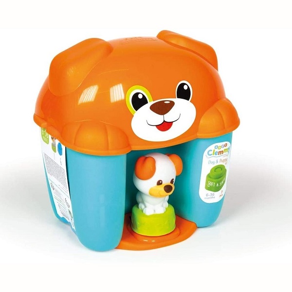 Un simpatico secchiello a forma di cagnolino, che contiene 6 morbidi mattoncini clemmy, pensati per far giocare i più piccoli in assoluta sicurezza