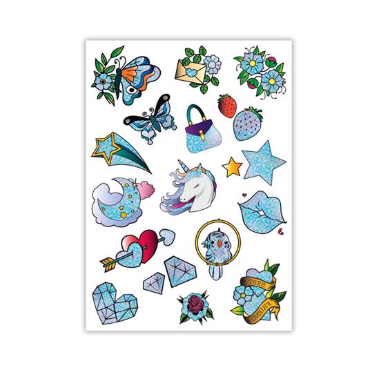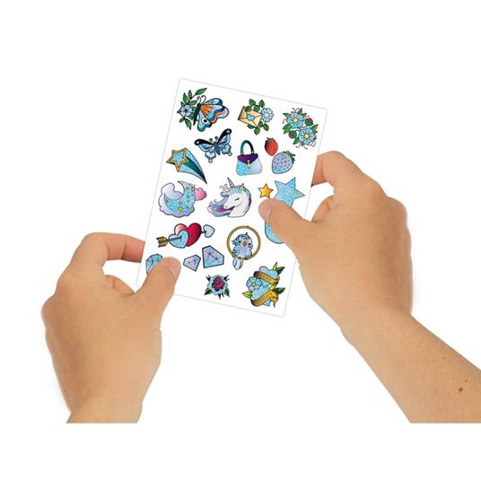 La tattoo mania diventa super scintillante con questo fantastico kit di tatuaggi trasferibili super glitterati! Tantissimi tattoo glitterati e sfavillanti per esprimere il proprio stile con un tocco super chic! Basta ritagliare il tatuaggio che si preferisce, applicarlo sulla pelle, bagnarlo con una spugnetta e il gioco è fatto! Un gioco che stimola la creatività e che permette ai bambini di raccontarsi attraverso i tatuaggi, per un look originale in ogni occasione!