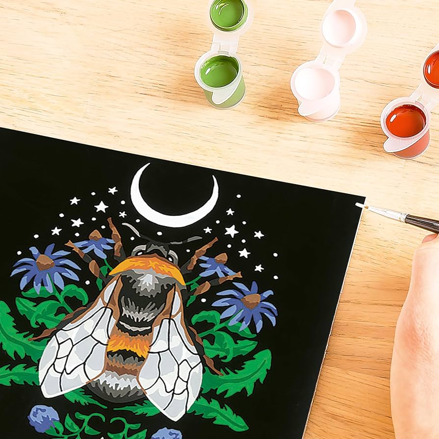 Ogni confezione contiene tutto il necessario per dipingere un bellissimo quadro e una cornice per poter appendere il proprio lavoro una volta terminato: una cartella prestampata, 1 pennello di qualità, barattolini di colori richiudibili singolarmente e cornice.