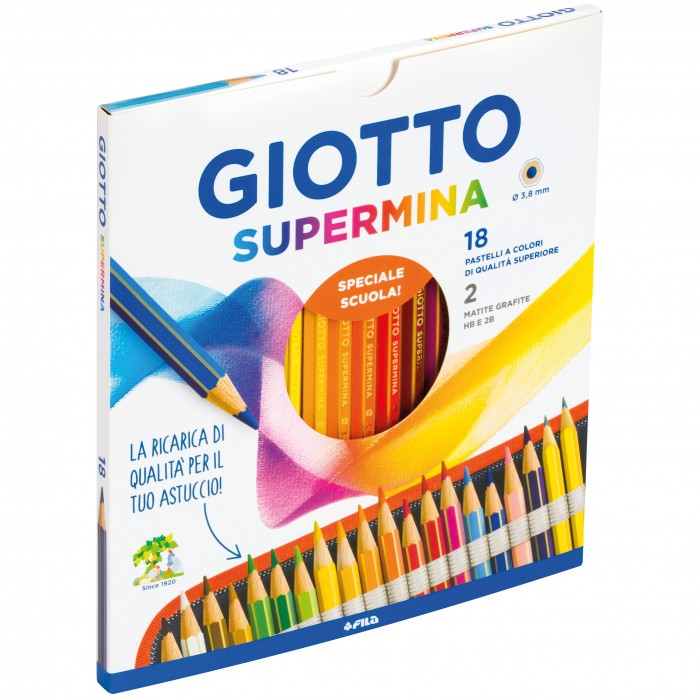 Ottima resa e lunga durata, Giotto Supermina, con la sua mina extra-large di qualità superiore 3,8 mm, è il top dei pastelli Giotto, con i suoi 46 colori vivaci e brillanti, estrema ergonomia e facile da temperare.
