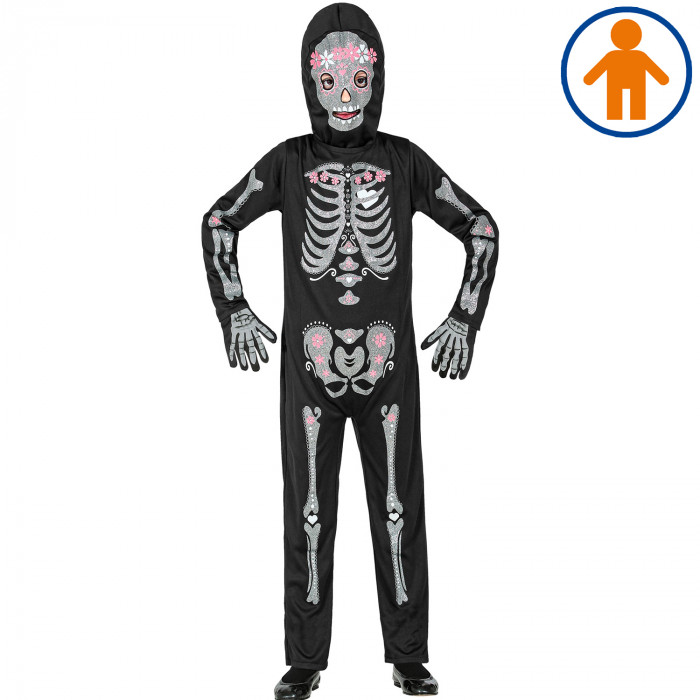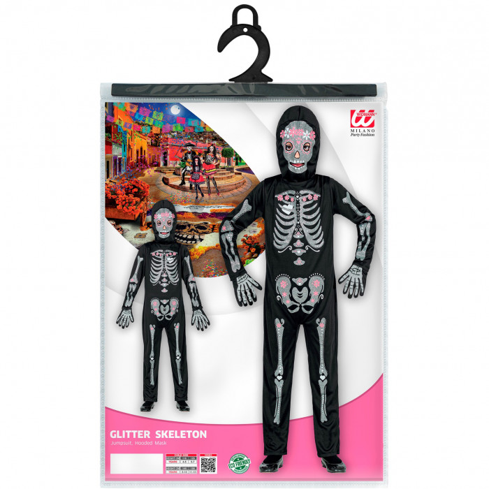 COSTUME BAMBINO SCHELETRO GLITTER CON TUTA, MASCHERA CON CAPPUCCIO WIDMANN