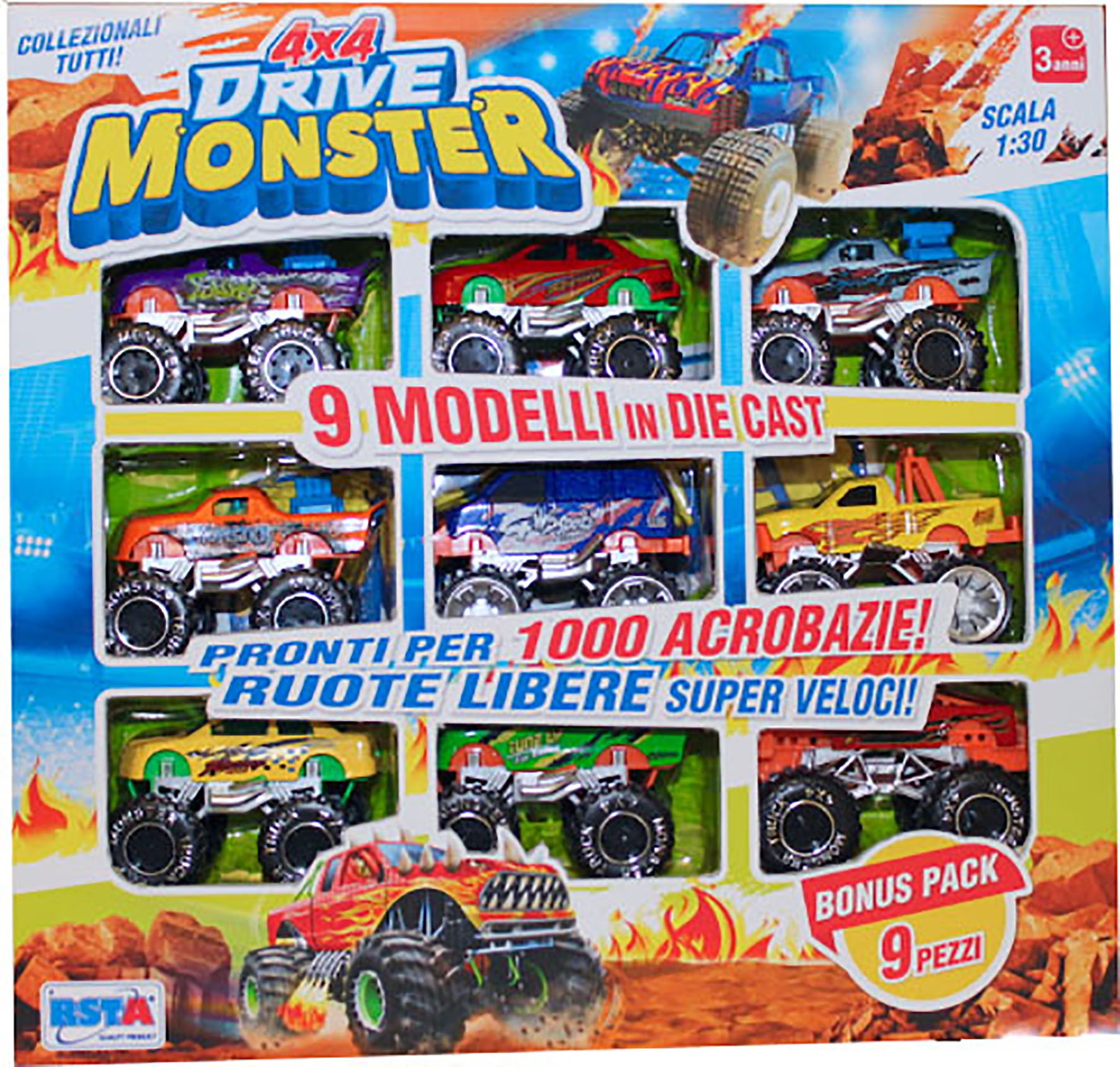 Set da 9 modellini Monster Drive, veicoli ruote libere.