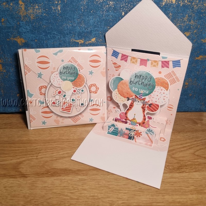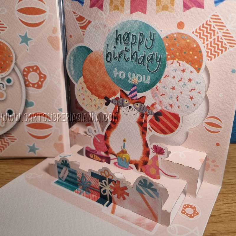 L’originale chiusura “a busta”, rivela all’apertura un pop-up bidimensionale che sorprende il festeggiato!