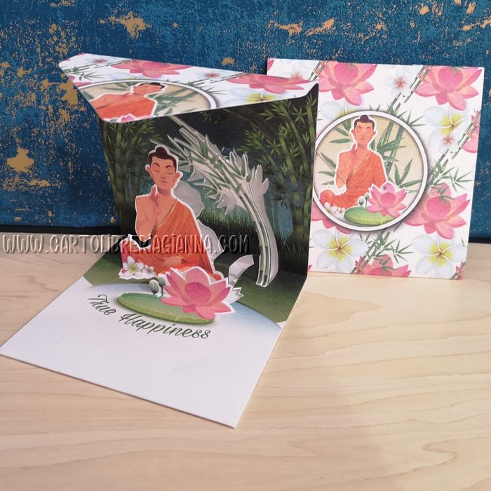 L’originale chiusura “a busta”, rivela all’apertura un pop-up bidimensionale che sorprende il festeggiato!