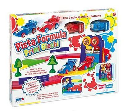 Pista Formula con 2 auto sportive a batteria, 13 parti assemblabili e 2 accessori di gioco. Dimensione confezione: 50x38x6x cm.