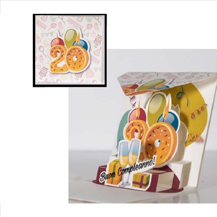 L’originale chiusura “a busta”, rivela all’apertura un pop-up bidimensionale che sorprende il festeggiato!