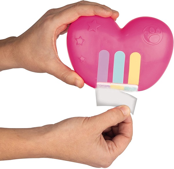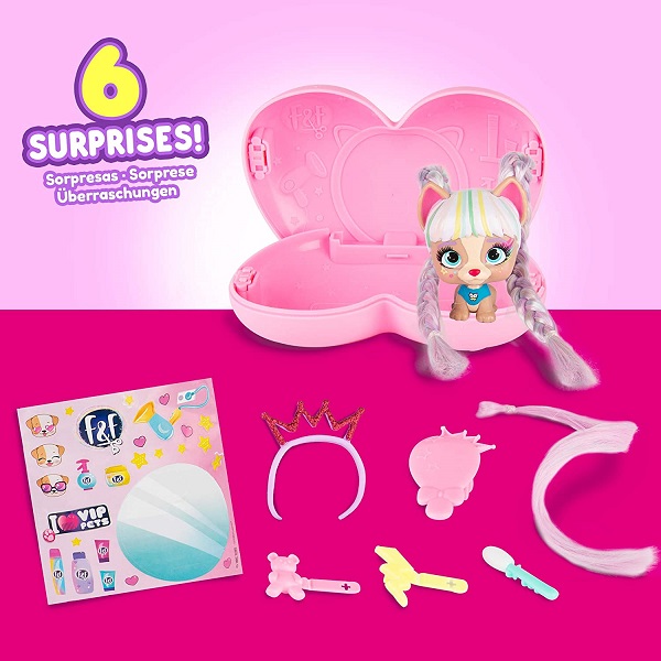Ogni capsula pettine a forma di cuore viene fornita con: 1 mini vip pets + 3 accessori per lo styling, un foglio raccoglitore e un foglio adesivo per creare un mini parrucchiere.